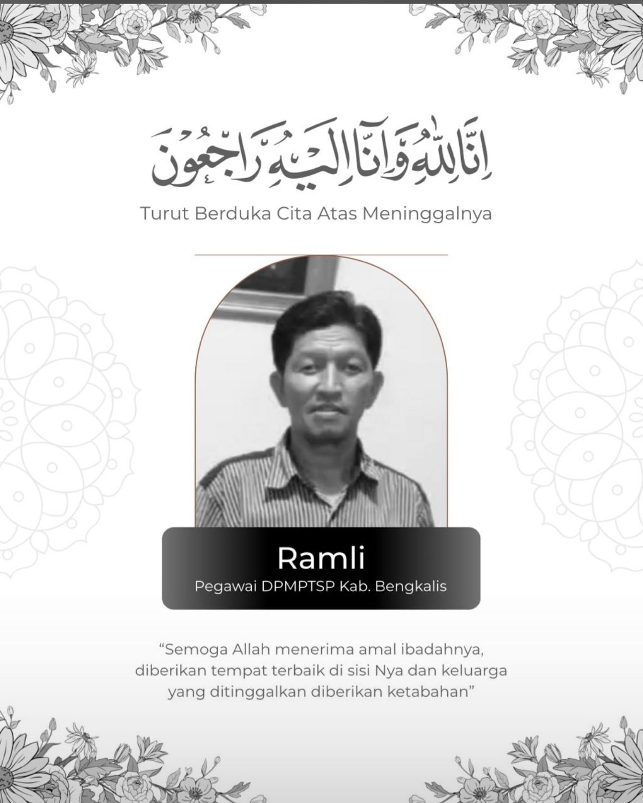 BENGKALIS - Bupati Bengkalis Kasmarni menyampaikan rasa belasungkawa mendalam atas wafatnya Staf Dinas Penanaman Modal dan Pelayanan Terpadu Satu Pintu (DPMPTSP) Kabupaten Bengkalis Ramli bin Rusli, Kamis 18 September 2025.