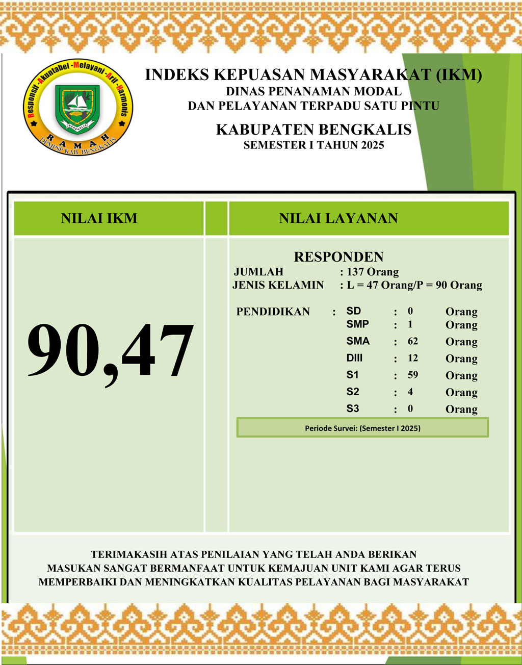 Alhamdulillah, puji sukur kehadirat Allah SWT, Tuhan Yang Maha Esa atas terlaksananya pengembangan Website Dinas Penanaman Modal dan Pelayanan Terpadu Satu Pintu Kabupaten Bengkalis. Dinas Penanaman Modal dan Pelayanan Terpadu Satu Pintu (DPMPTSP) Kabupaten Bengkalis merupakan perpanjangan tangan pemerintah untuk memfasilitasi dan mempromosikan daerah Kabupaten Bengkalis serta berkomitmen melayani investor dengan cara menyajikan informasi yang akurat tentang penyelenggaraan perizinan berusaha dan nonperizinan, potensi ekonomi, dan sektor-sektor yang diunggulkan. Kami berharap website ini dapat berfungsi sebagai referensi bagi investor sehingga dapat berinvestasi di Kabupaten Bengkalis.