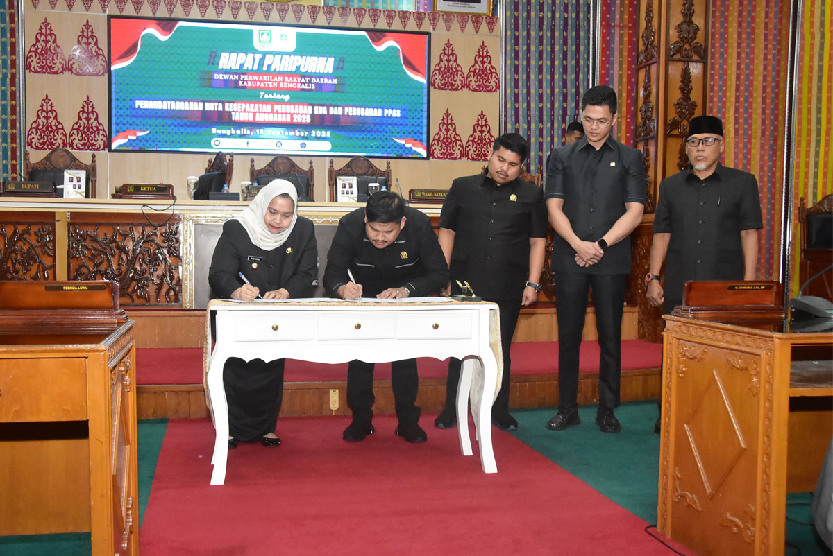 BENGKALIS - Dewan Perwakilan Rakyat Daerah (DPRD) Kabupaten Bengkalis bersama Pemerintah Kabupaten (Pemkab) Bengkalis secara resmi menandatangani nota kesepakatan Perubahan Kebijakan Umum Anggaran (KUA) dan Perubahan Prioritas Plafon Anggaran Sementara (PPAS) untuk Anggaran Pendapatan dan Belanja Daerah (APBD) Perubahan tahun 2025.