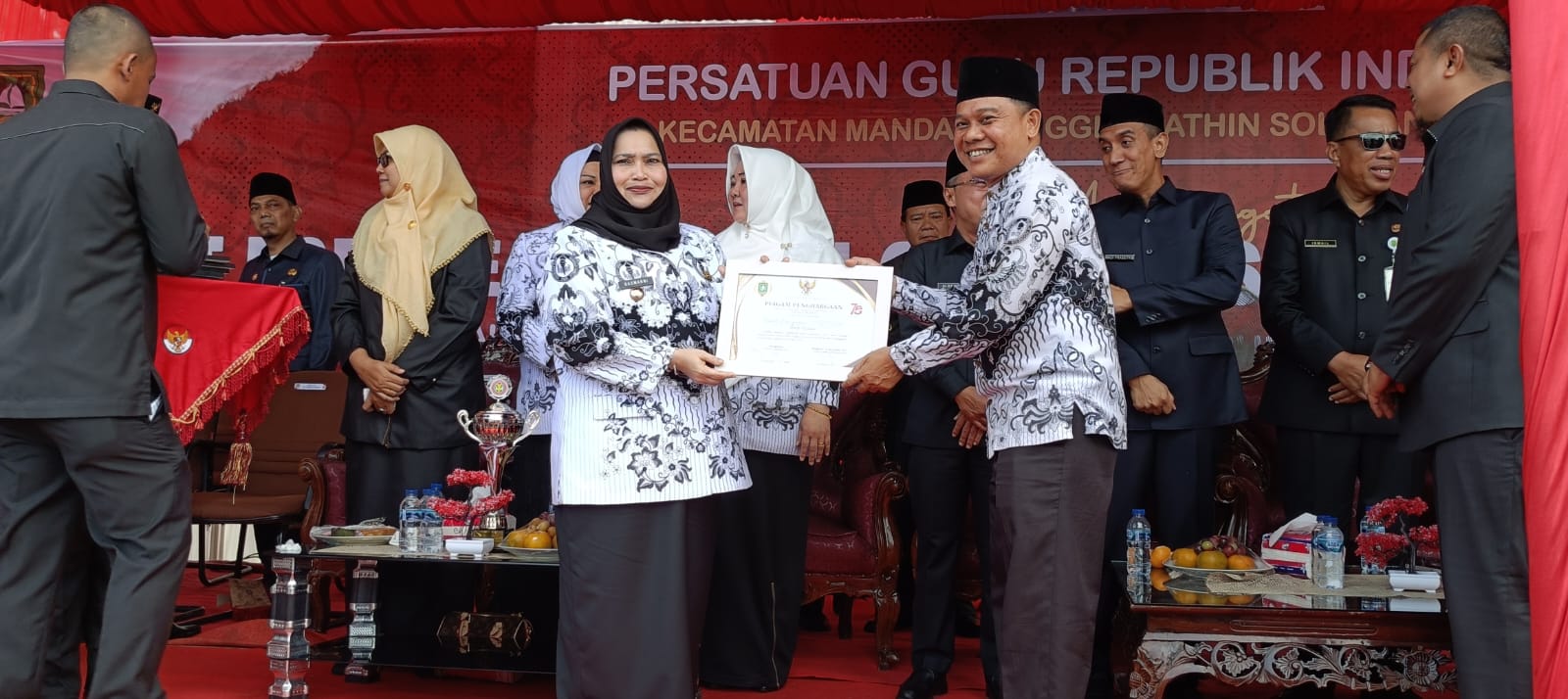 MANDAU - Sempena peringatan Hari Guru Nasional (HGN) 2023, Bupati Kasmarni berkesempatan menyerahkan sejumlah penghargaan.