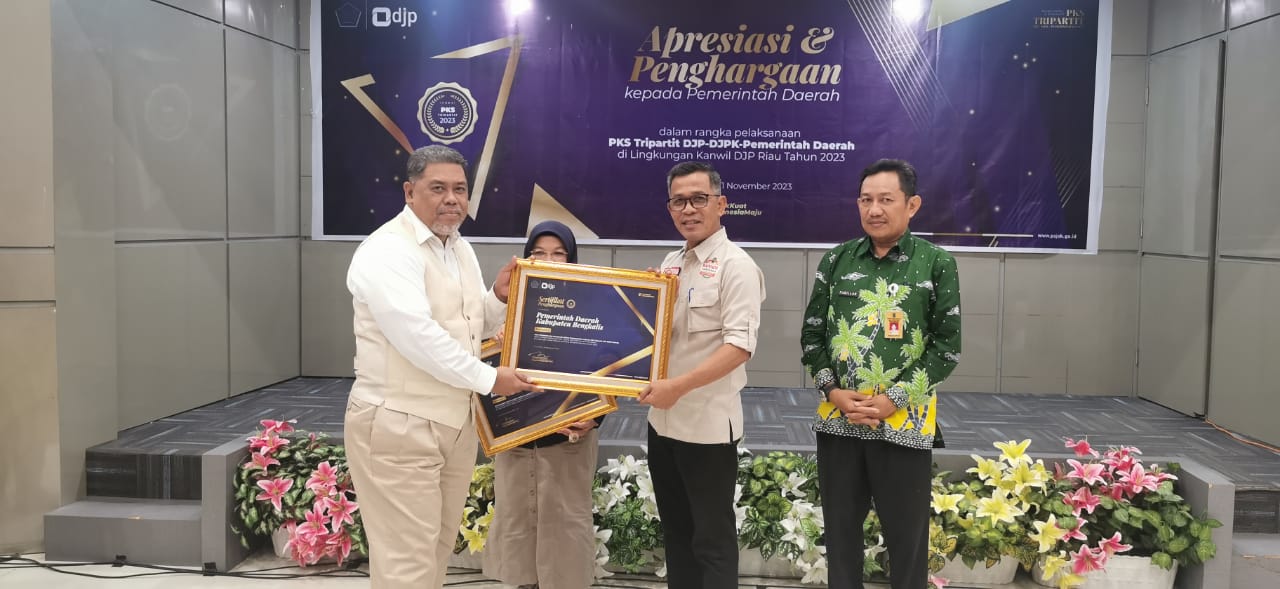 PEKANBARU - Pemerintah Kabupaten Bengkalis kembali meraih penghargaan atas pelaksanaan Perjanjian Kerja Sama Tripartit DJP-DJPK bersama Pemerintah Daerah terkait Optimalisasi Pemungutan Pajak Pusat dan pajak Daerah antara DJP, DJPK, dan Pemerintah Daerah di Wilayah Kanwil DJP Riau.